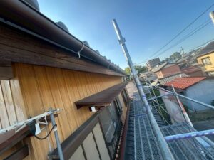 既存の木部破風は腐食が進んでおり、塗装しても数年で再発の恐れがありましたので、耐久性の高いガルバリウム鋼板でカバー工法を提案し施工させて頂きました。また、足場を組むためお客様から「せっかくなら雨樋も一緒に治したい」とのご依頼を頂きましたので、全面交換で適正勾配へ調整いたしました。