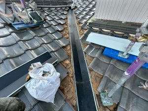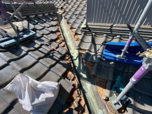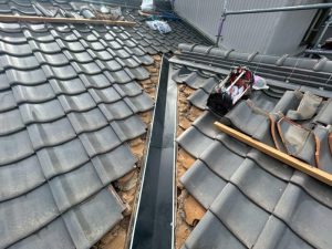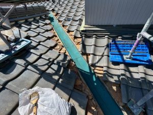 まずは、谷板金に重なるようにある瓦を撤去していきます。